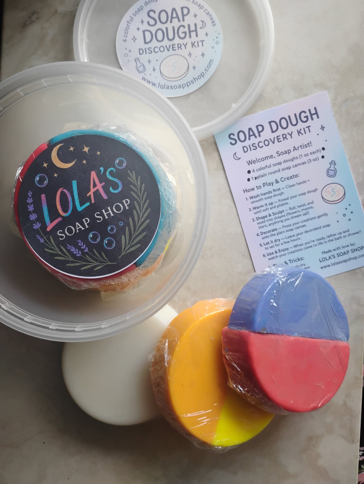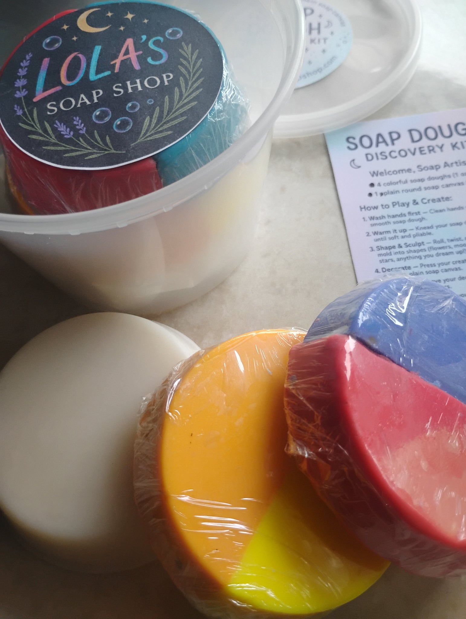 4, 1 oz colores of soap dough and a 3.5 oz soap puck for decorating so you can discover the magic of soap dough. ✨